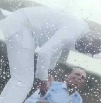 In a video shared online, the suicidal man is seen sitting on the floor, looking dejected, as his rescuers flanked him and held onto both arms to prevent him from going over the bridge into the lagoon.