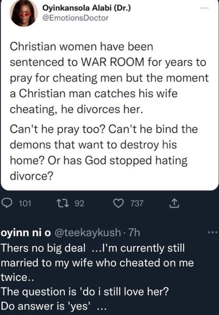 “Christian women have been sentenced to WAR ROOM for years to pray for cheating men but the moment a Christian man catches his wife cheating. he divorces her. Can’t he pray too? Can’t he bind the demons that want to destroy his home? Or has God stopped hating divorce?”