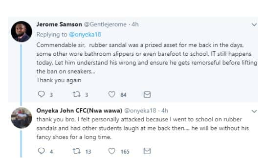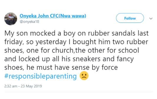 Onyeka John wrote: “My son mocked a boy on rubber sandals last friday, so yesterday I bought him two rubber shoes, one for church,the other for school and locked up all his sneakers and fancy shoes, he must have sense by force #responsibleparenting”