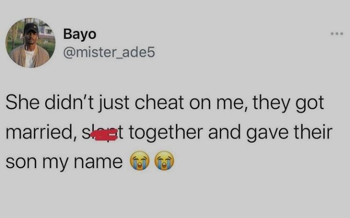 He wrote, “She didn’t just cheat on me; they got married, slept together, and gave their son my name.”