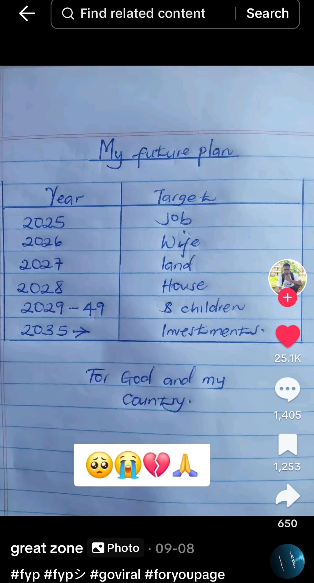 A Nigerian man breaks the internet as he shares his life plans: to get a job in 2025, marry in 2026, buy a house in 2027, have children in 2028, and pursue many more goals from 2029 to 2049, with investments starting in 2035.
