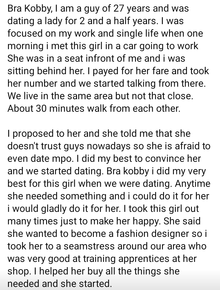 “Bra Kobby, I am a guy of 27 years and was dating a lady for 2 and a half years. I was focused on my work and single life when one morning i met this girl in a car going to work She was in a Seat infront of me and i was sitting behind her. I payed for her fare and took her number and we started talking from there. We live in the same area but not that close. About 30 minutes walk from each other.