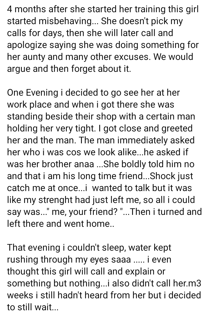 4 months after she started her training this girl started misbehaving… She doesn’t pick my calls for days, then she will later call and apologize saying she was doing something for her aunty and many other excuses. We would argue and then forget about it.