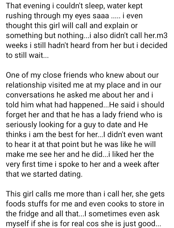 One of my close friends who knew about our relationship visited me at my place and in our conversations he asked me about her and i told him what had happened…He said i should forget her and that he has a lady friend who is seriously looking for a guy to date and He thinks i am the best for her…I didn’t even want to hear it at that point but he was like he will make me see her and he did…i liked her the very first time i spoke to her and a week after that we started dating.