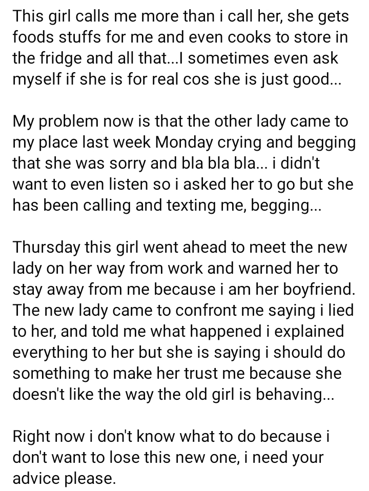 Thursday this girl went ahead to meet the new lady on her way from work and warned her to stay away from me because i am her boyfriend. The new lady came to confront me saying i lied to her, and told me what happened i explained everything to her but she is saying i should do something to make her trust me because she doesn’t like the way the old girl is behaving…