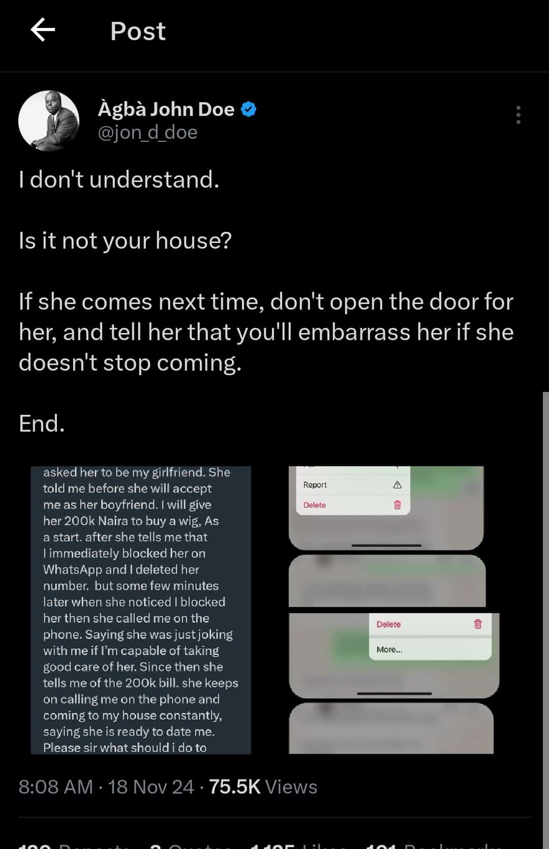 “Since then, she keeps telling me about the 200k bill. She constantly calls me and comes to my house, saying she is ready to date me. Please, sir, what should I do to stop her from coming to my house and calling me on the phone, because I don’t want her anymore.”