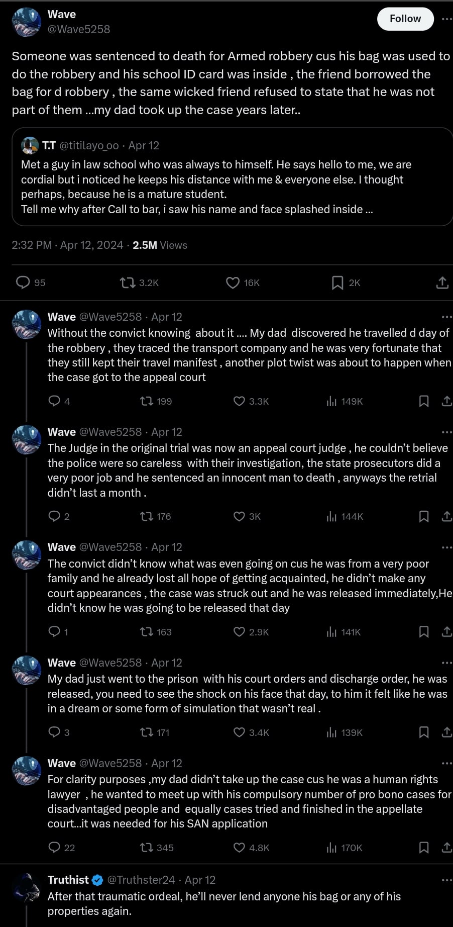The user’s statement continued: “Someone was sentenced to death for armed robbery because his bag was used in the robbery and his school ID card was inside.”