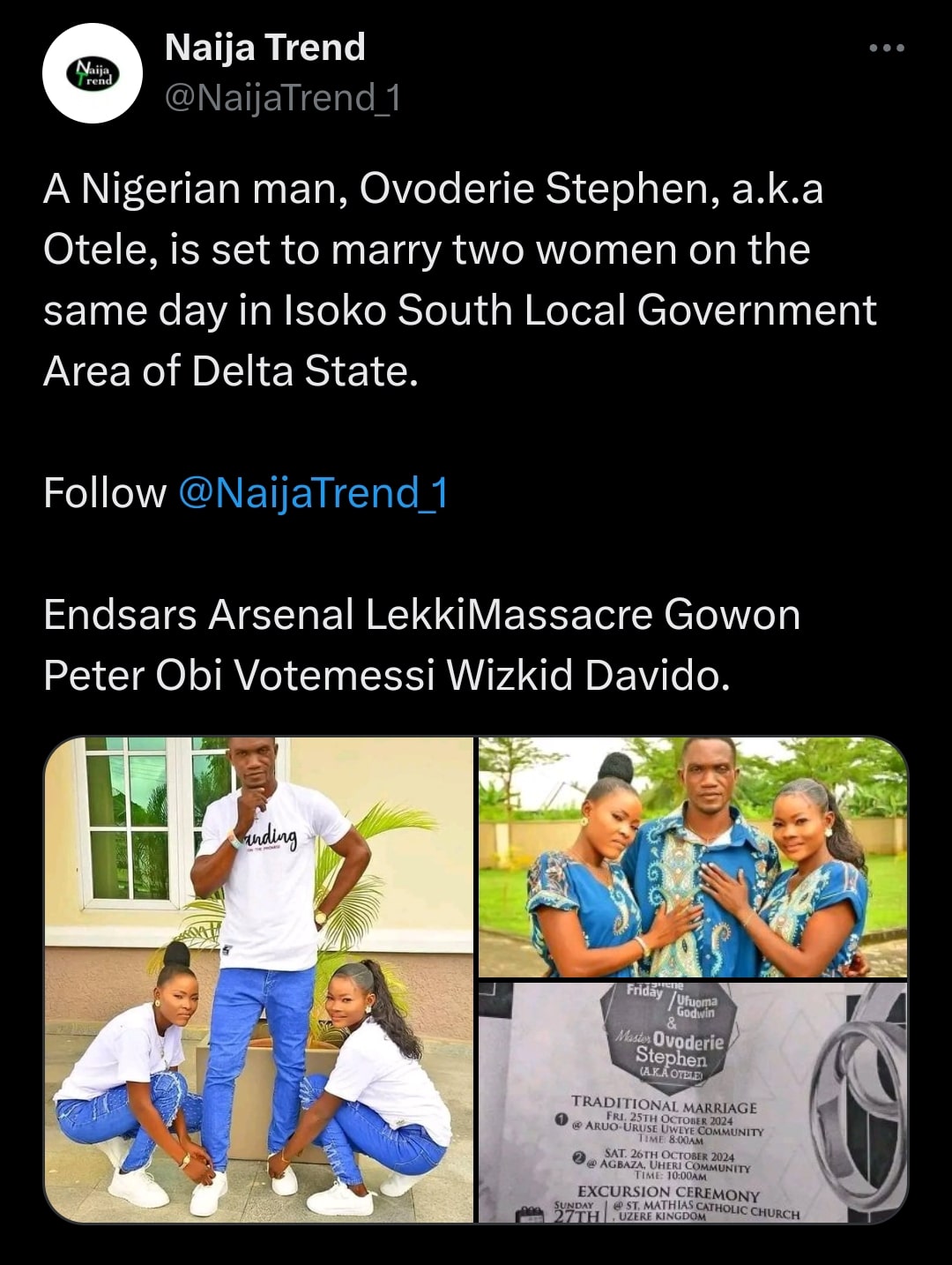The post reads: “A Nigerian man, Ovoderie Stephen, also known as Otele, is set to wed two women on the same day in Isoko South Local Government Area of Delta State.”