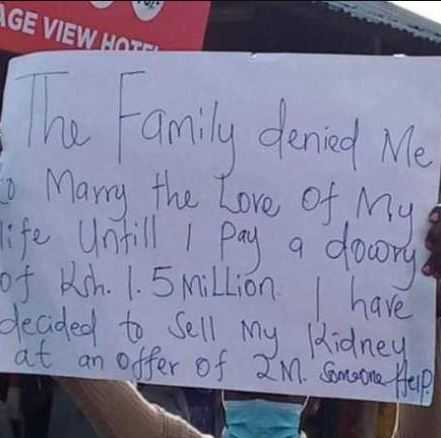 A yet to be identified Kenyan put out a placard notifying the general public of his intentions to sell his kidney for Ksh 1.5 (N5.4M) to raise money for bride price.