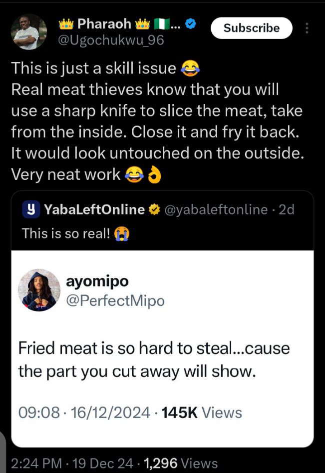Another X user, Ayomipo, had earlier on, lamented on the difficulty of stealing fried meat.