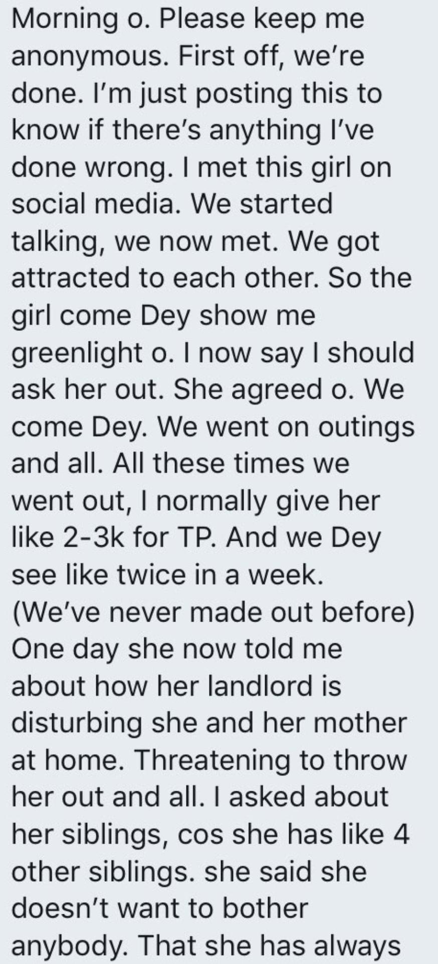 However, after a short time, she started complaining about their house rent being due, and how the landlord wants to throw her family out.