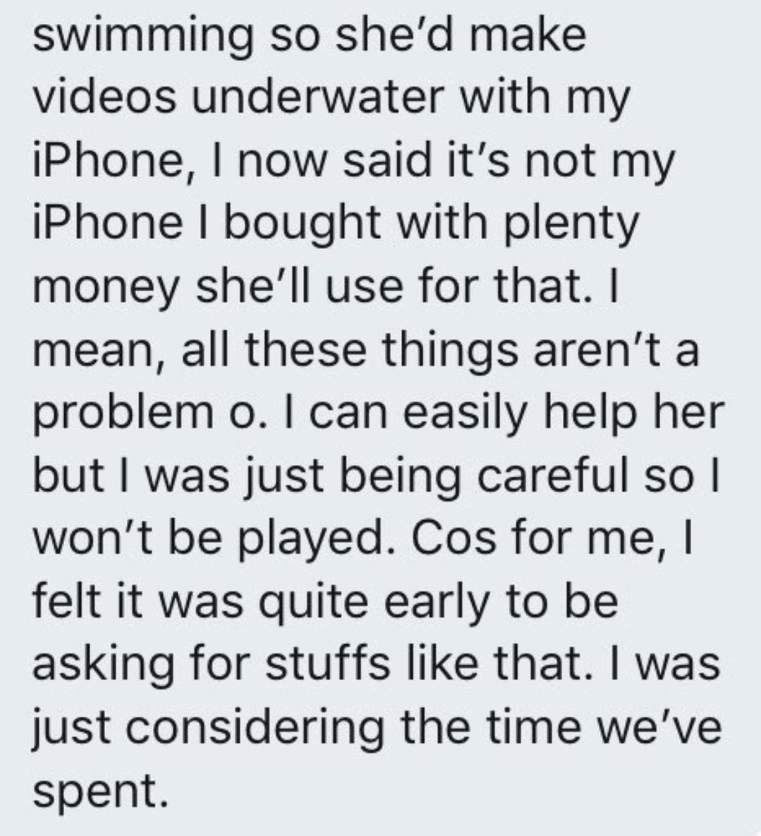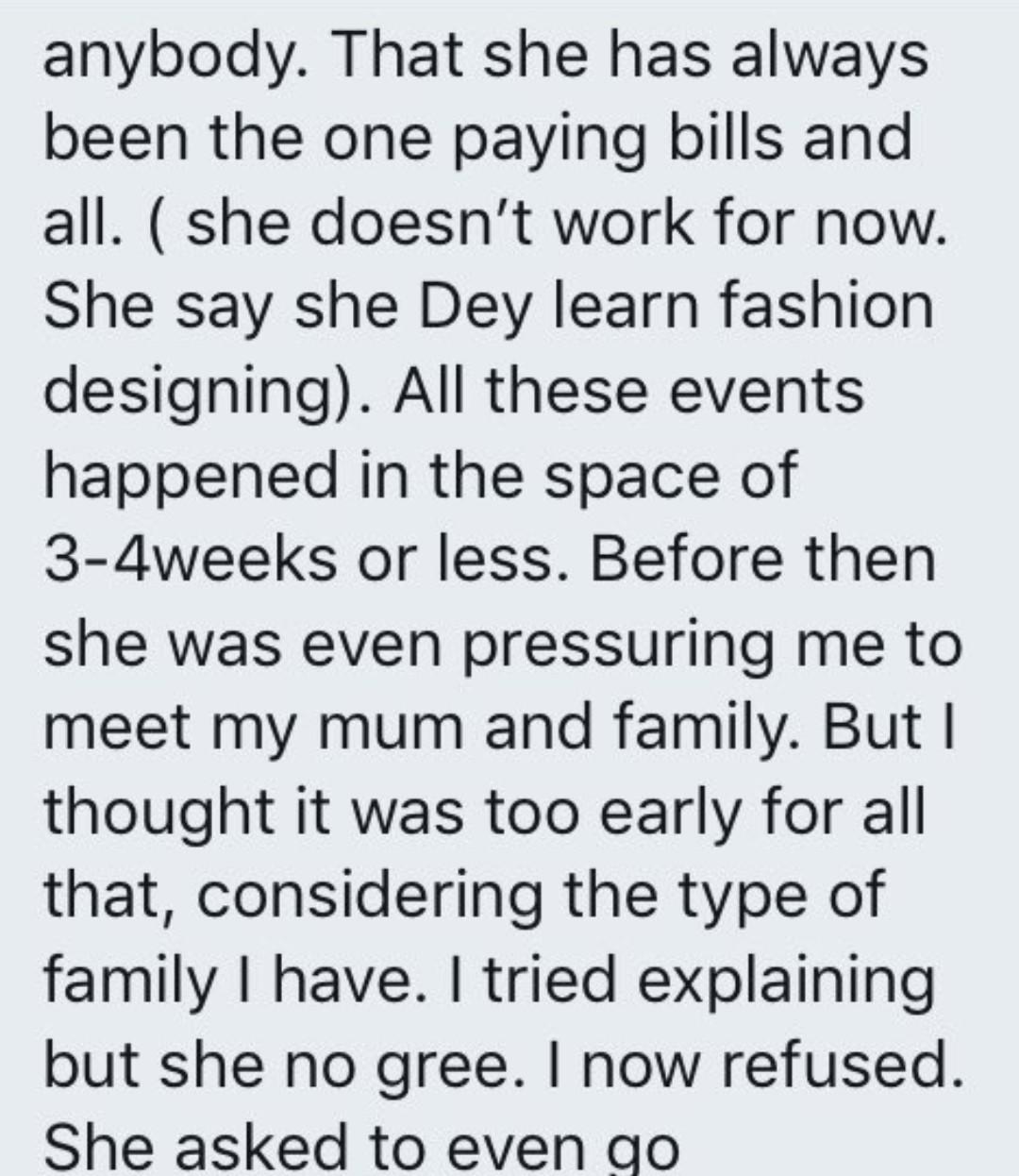 Three weeks later, she was asking to meet his mother and family members, and he bluntly refused, cause according to him, it’s still very early for that.