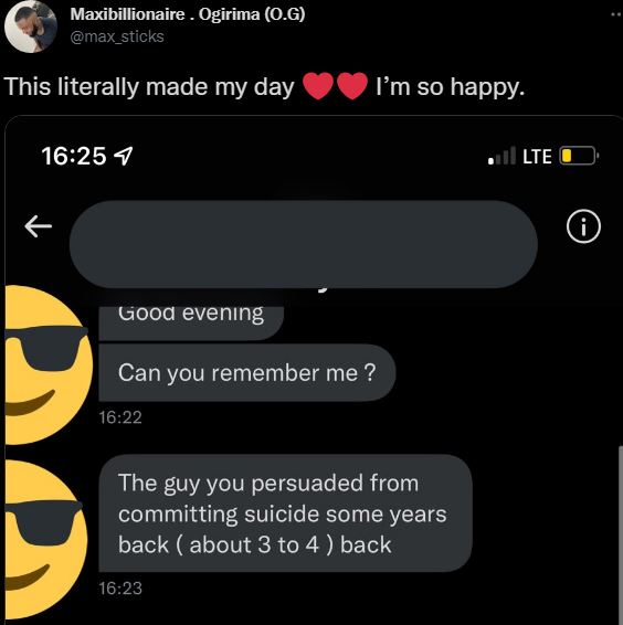 A Twitter user identified by his handle as @max_sticks has taken to the bird app to share his chat with a lad whom he stopped from committing suicide some years back.