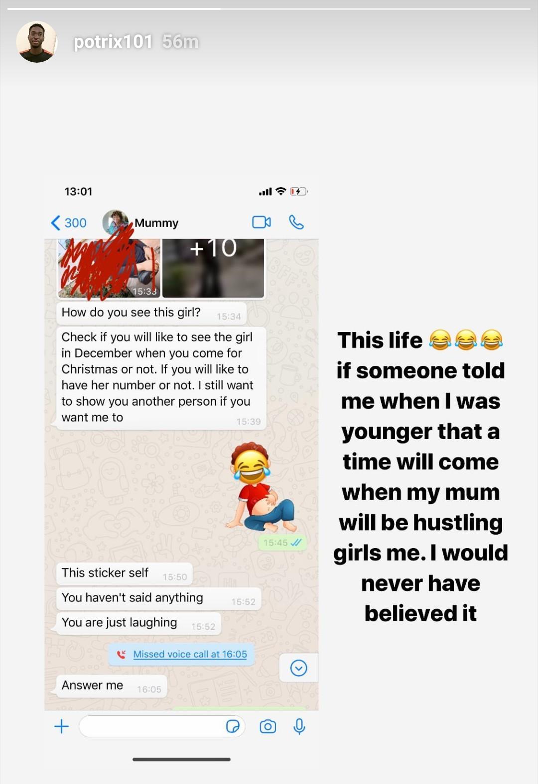 “Check if you will like to see this girl in December when you come home for Christmas or not. If you will like to have her number or not. I still want to show you another person if you want me to”, his mom wrote.