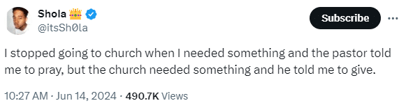 @oriadee__ noted: “It’s 2024 and some people still believe all these pastors and refuse to understand that church is a business center.”