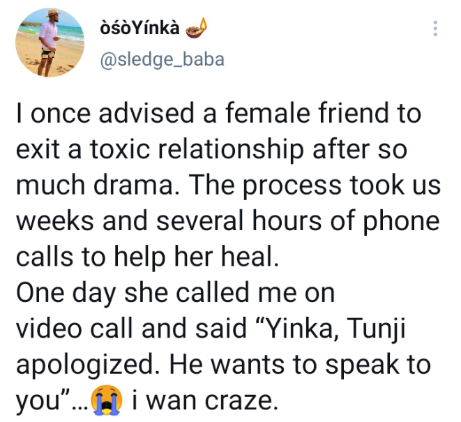 A man identified as Oso Yinka has narrated his experience after advising his female friend to exit her toxic relationship.