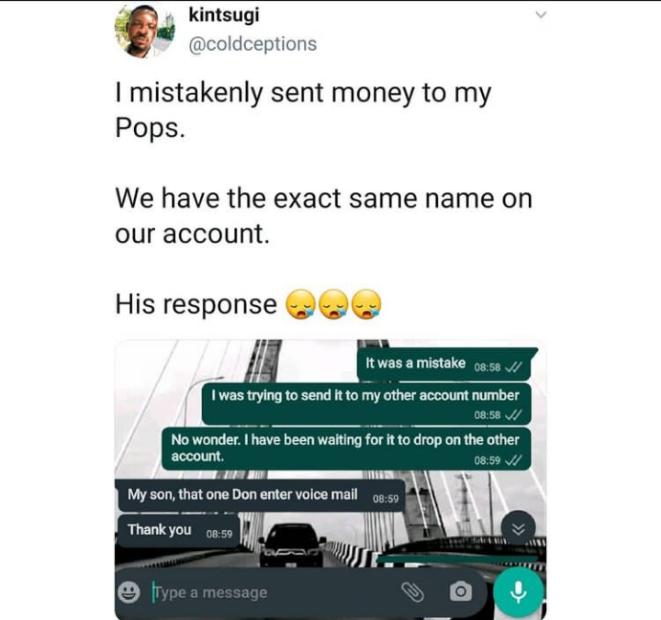 Twitter user, identified as coldceptions has shared the epic response of his father after he mistakenly sent money to his account.
