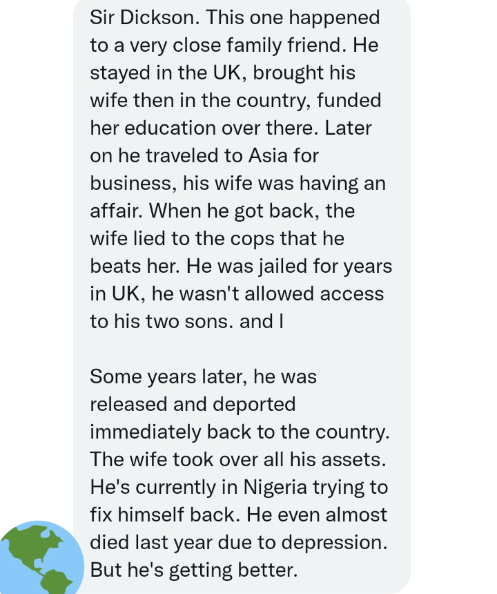 Sir Dickson. This one happened to a very close family friend. He stayed in the UK, brought his wife then in the country, funded her education over there. Later on he traveled to Asia for business, his wife was having an affair.