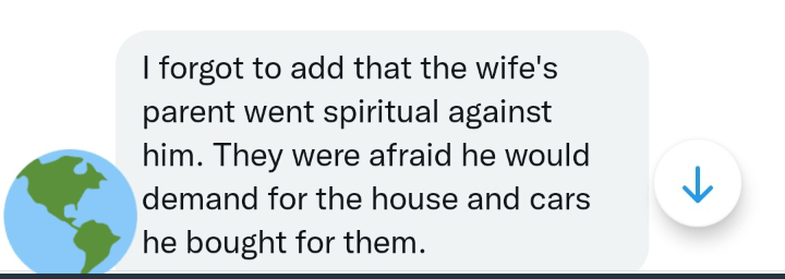 “I forgot to add that the wife’s parent went spiritual against him. They were afraid he would demand for the house and cars he bought for them.