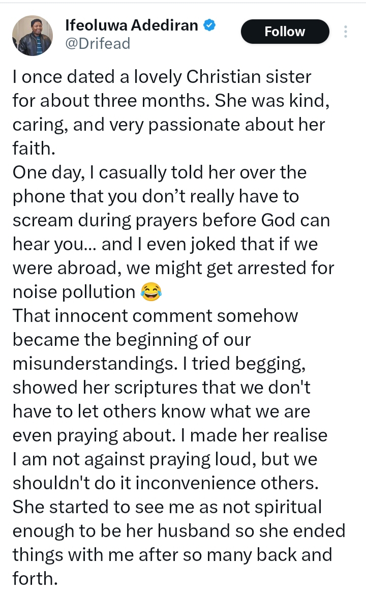 A man identified as @Drifeadi has shared a personal story about how differing views on prayer style led to the end of a relationship with a former partner.