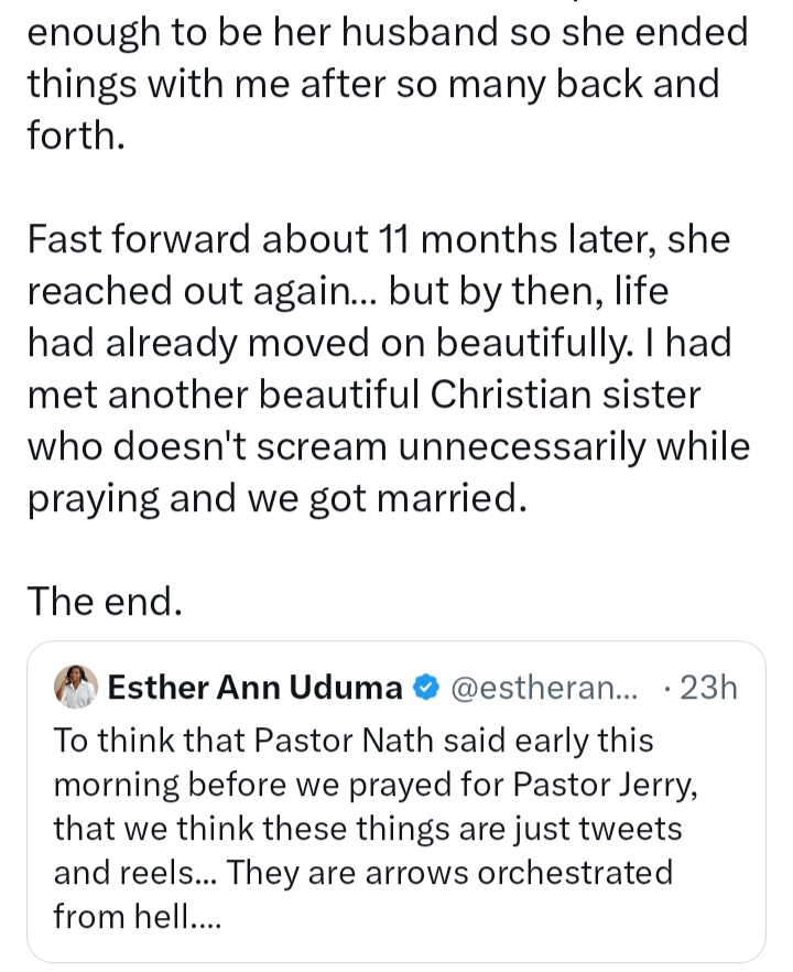 Fast forward about 11 months later, she reached out again… but by then, life had already moved on beautifully. I had met another beautiful Christian sister who doesn’t scream unnecessarily while praying and we got married.