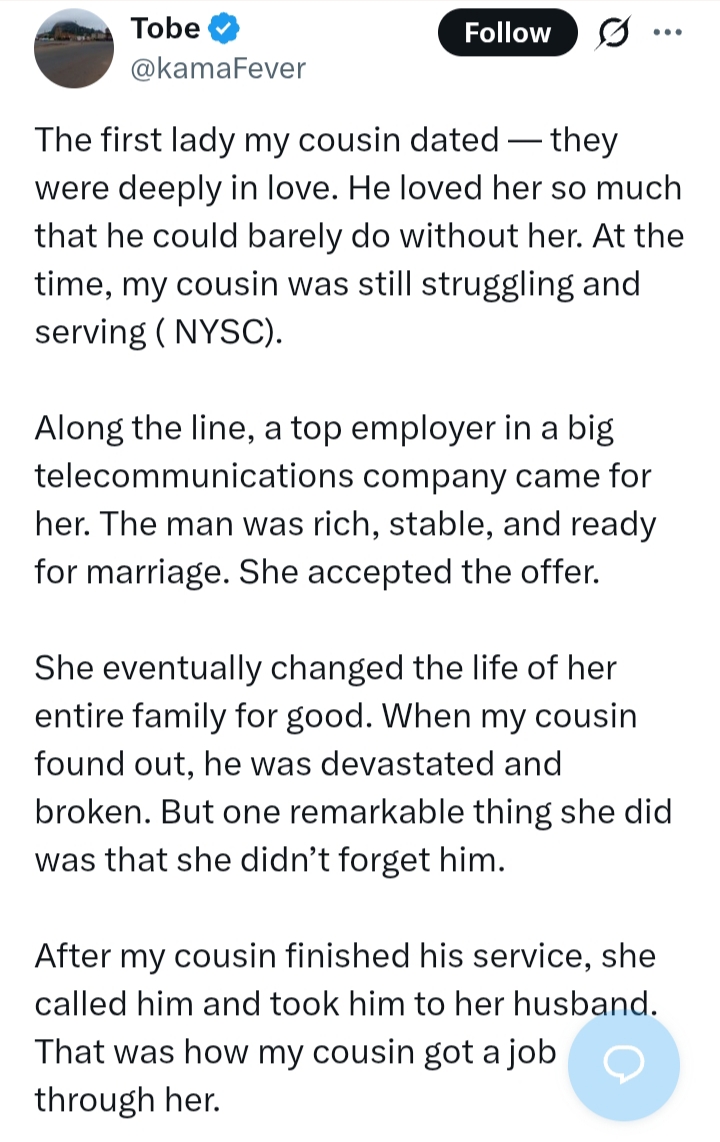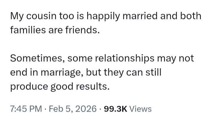 A Nigerian man has shared a reflective story on social media about his cousin’s past relationship, noting how some relationships, even when they do not lead to marriage, can still result in positive outcomes.