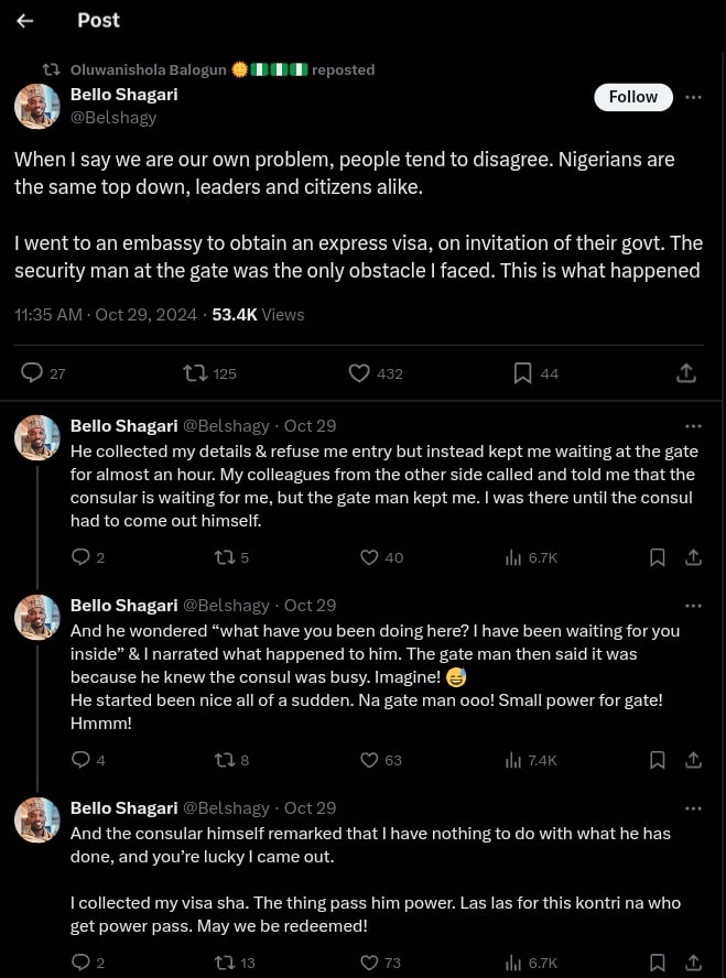In a post on X (formerly Twitter), he lamented that “every Nigerian is corrupt,” recounting how the gateman at the embassy delayed him without explanation.