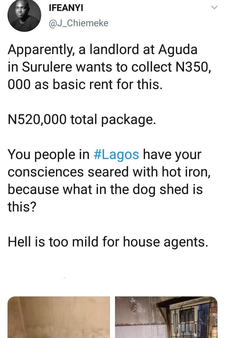 “Apparently, a landlord at Aguda in Surulere wants to collect N350, 000 as basic rent for this. N520,000 total package. You people in #Lagos have your consciences seared with hot iron, because what in the dog shed is this? Hell is too mild for house agents.”