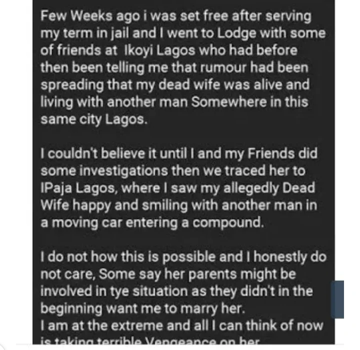 Few weeks ago, I was set free after serving my time in jail and I went to lodge with some of my friends in Ikoyi who told me about the rumour that was spreading that my dead wife is alive and living with another man in this same Lagos.