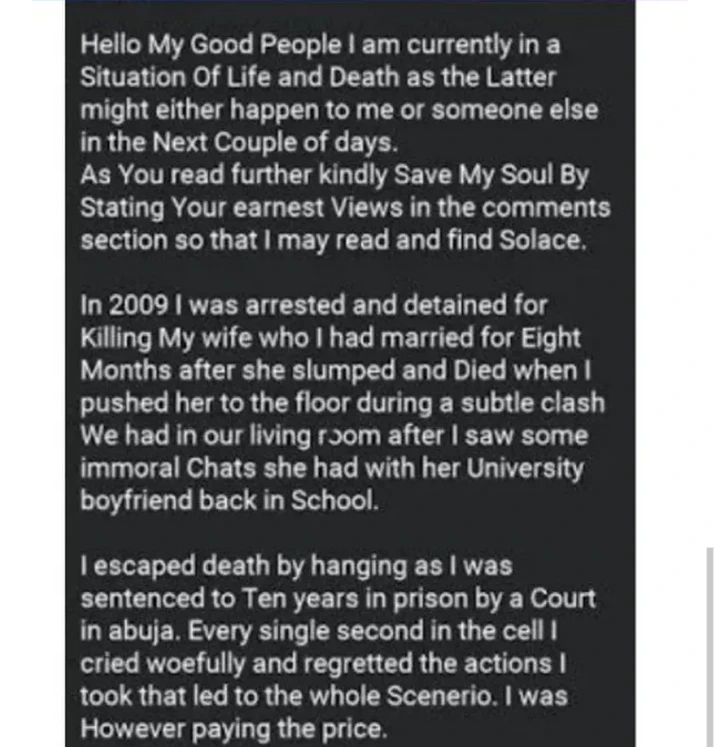 “In 2009, I was arrested and detained for killing my wife after she slumped and died when I pushed her to the floor during a subtle clash we had in our living room after I some immoral chats she had with her university boyfriend back then in school.