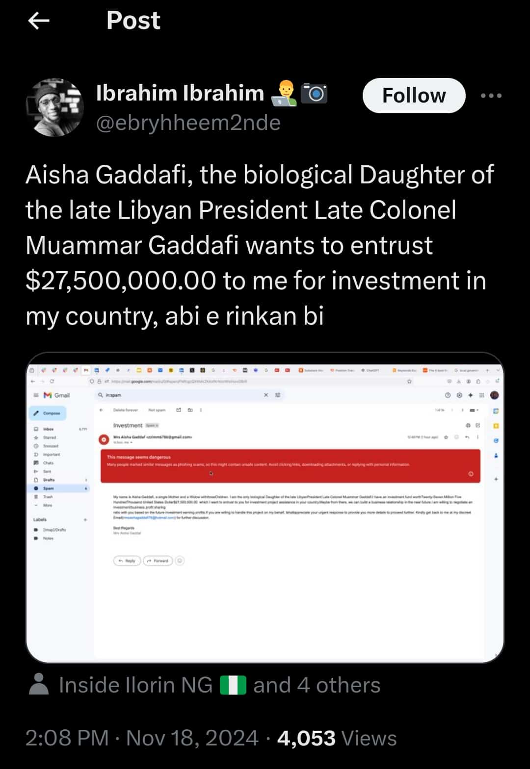 He wrote: “Aisha Gaddafi, the biological daughter of the late Libyan President, Colonel Muammar Gaddafi, wants to entrust $27,500,000.00 to me for investment in my country. Abi, e rinkan bi?”
