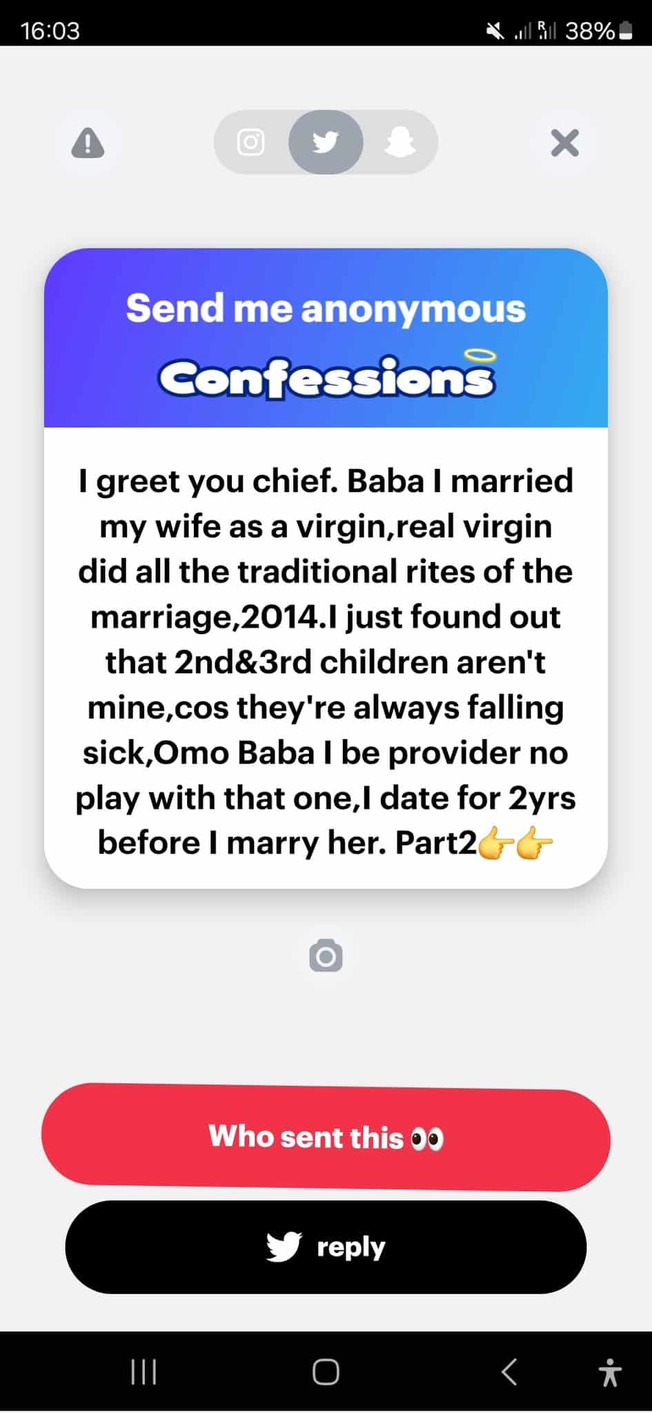In his words: “I greet you, Chief. I married my wife as a virgin, a real virgin. Did all the traditional rites for our marriage in 2014. I just found out that my 2nd and 3rd children aren’t mine because they’re always falling sick. I dated her for 2 years before we married, and I provided everything.”
