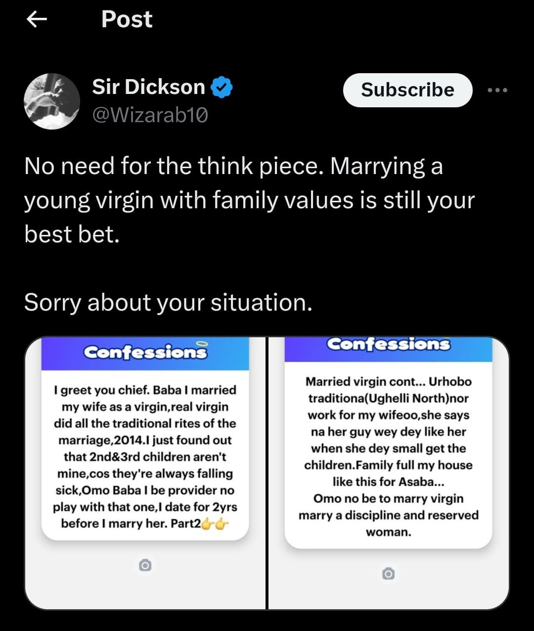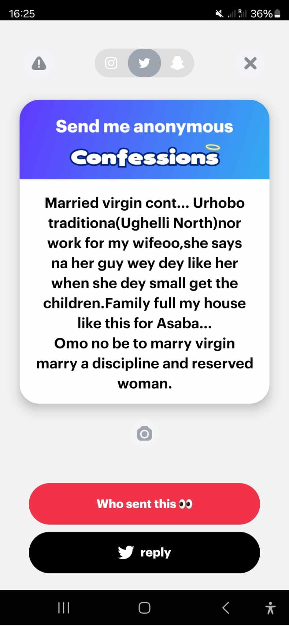 @Alex_D_grt: “This story looks made up judging from the last statement he made . Virgin or not, if you don’t vet her properly then your story will end up in sorry , btw how sure are you that she’s truly a virgin.”