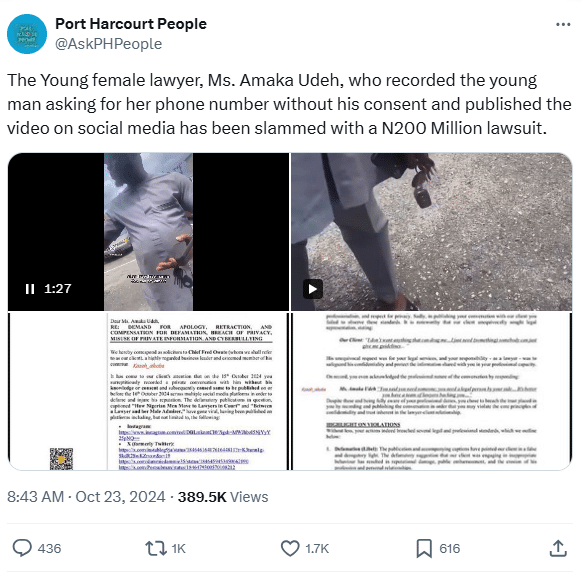 “The Young female lawyer, Ms. Amaka Udeh, who recorded the young man asking for her phone number without his consent and published the video on social media has been slammed with a N200 Million lawsuit.”