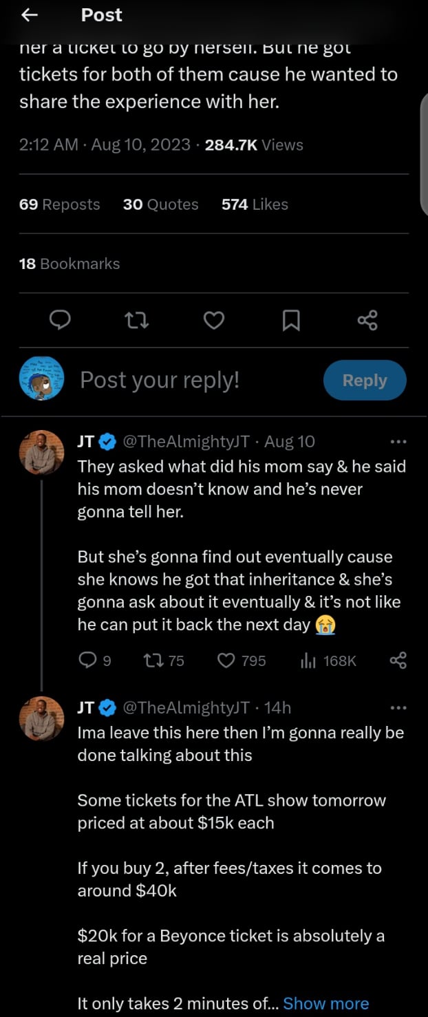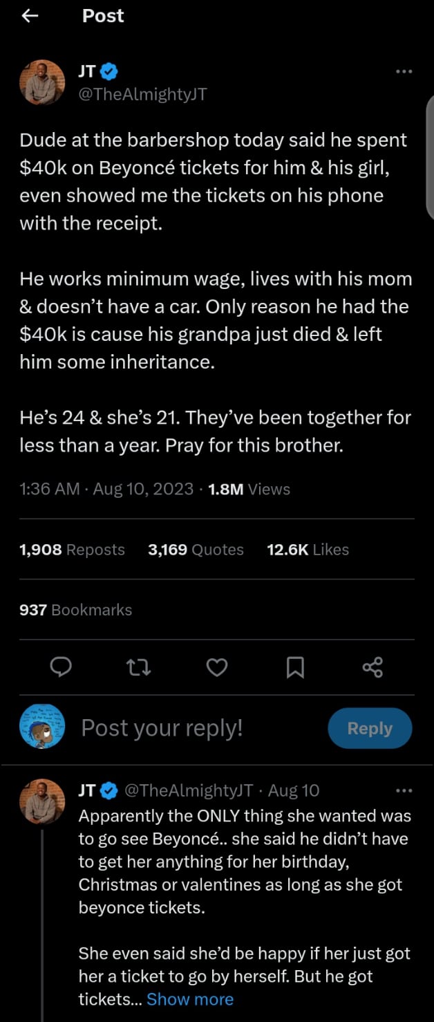 The person who shared the post expressed his concern, writing, “Dude at the barbershop today said he spent $40k on Beyoncé tickets for him & his girl, even showed me the tickets on his phone with the receipt. “