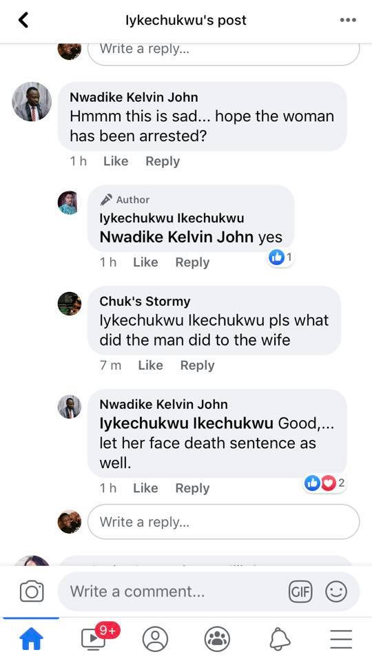 Facebook user Iykechukwu Ikechukwu who shared videos from the scene of the incident, claimed the man never cheated on his wife and only preached ”repentance” to her. According to him, the suspect has since been arrested.