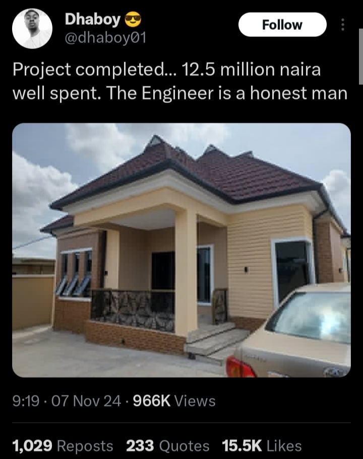 “Project completed… 12.5 million naira well spent. The Engineer is a honest man”