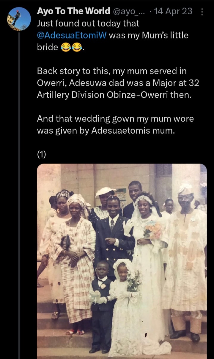 “Just found out today that @AdesuaEtomiW was my Mum’s little bride 😂😂.
