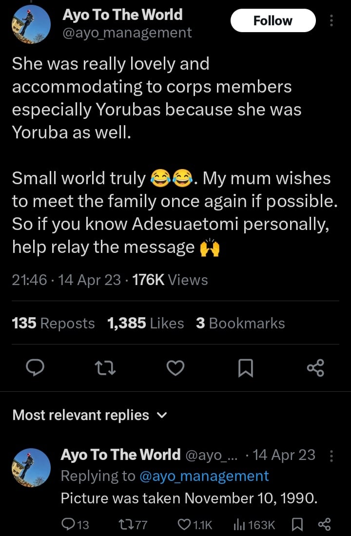 Small world truly 😂😂. My mum wishes to meet the family once again if possible. So if you know Adesuaetomi personally, help relay the message 🙌”