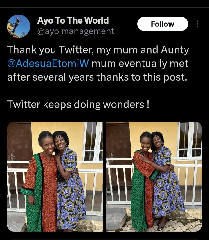 “Thank you Twitter, my mum and Aunty @AdesuaEtomiW mum eventually met after several years thanks to this post.