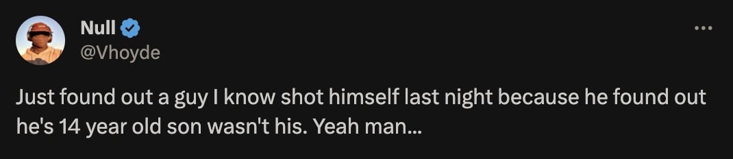 “Just found out a guy I know shot himself last night because he found out he’s 14 year old son wasn’t his. Yeah man.”