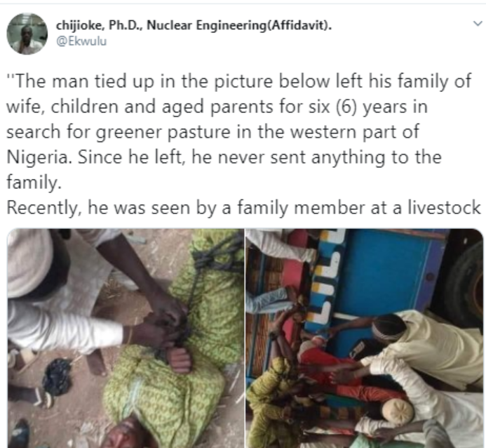 A Twitter user with the handle @Ekwulu, has claimed that a man was tied up and sent back home after leaving his family in search of greener pastures for six years.