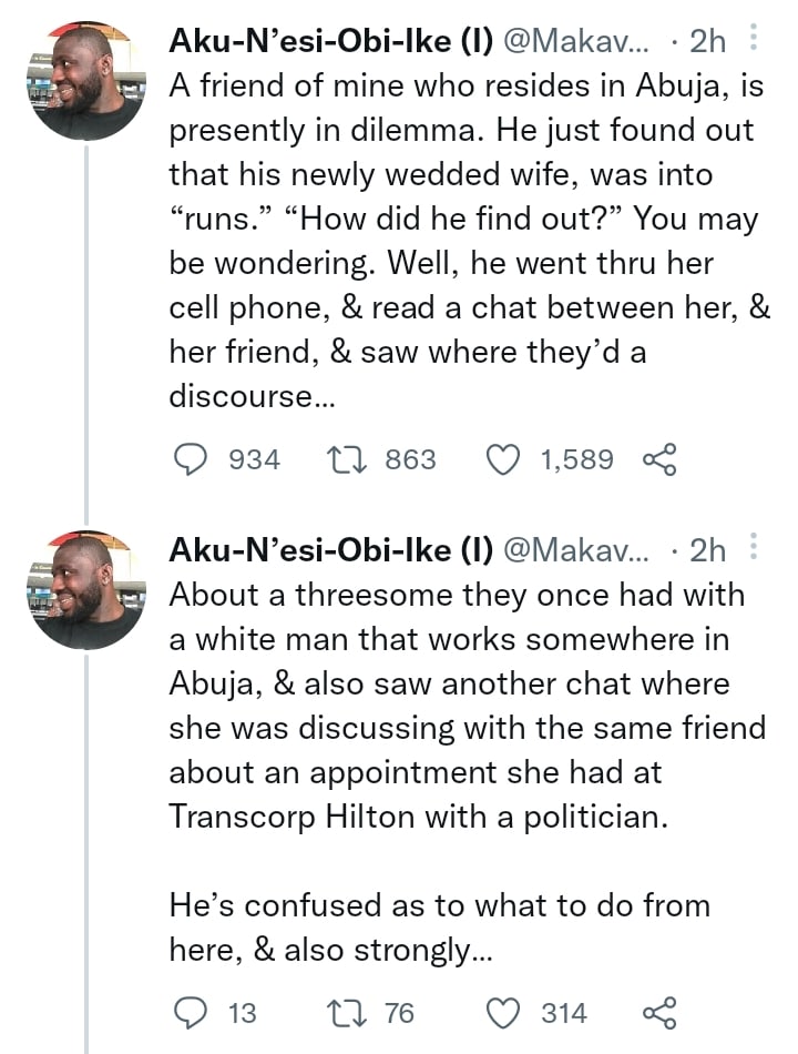 “A friend of mine who resides in Abuja, Is presently in dilemma. He just found out that his newly wedded wife, was into “runs.” “How did he find out?” You may be wondering. Well, he went thru her cell phone, & read a chat between her, & her friend, & saw where they’d a discourse…