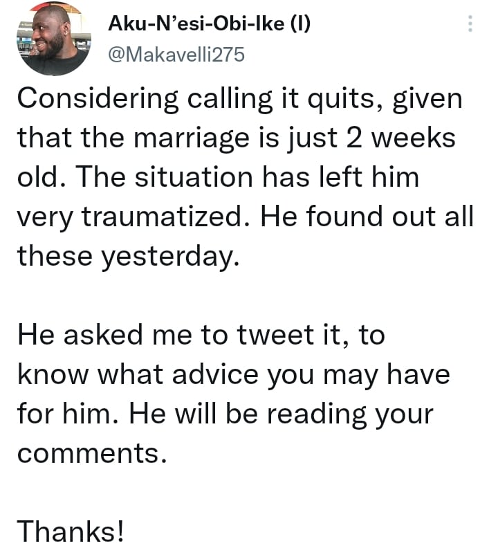 Considering calling it quits, given that the marriage is just 2 weeks old. The situation has left him very traumatized. He found out all these yesterday.