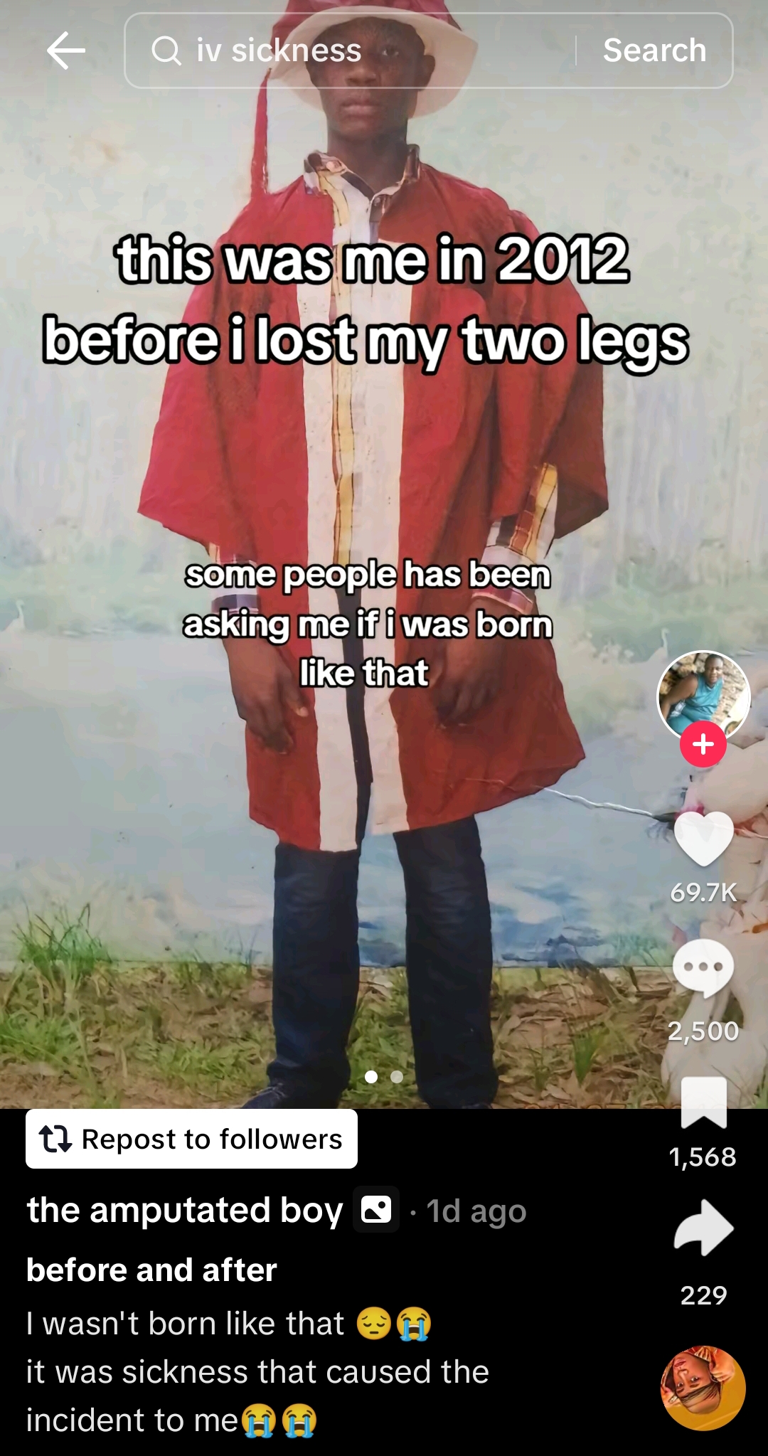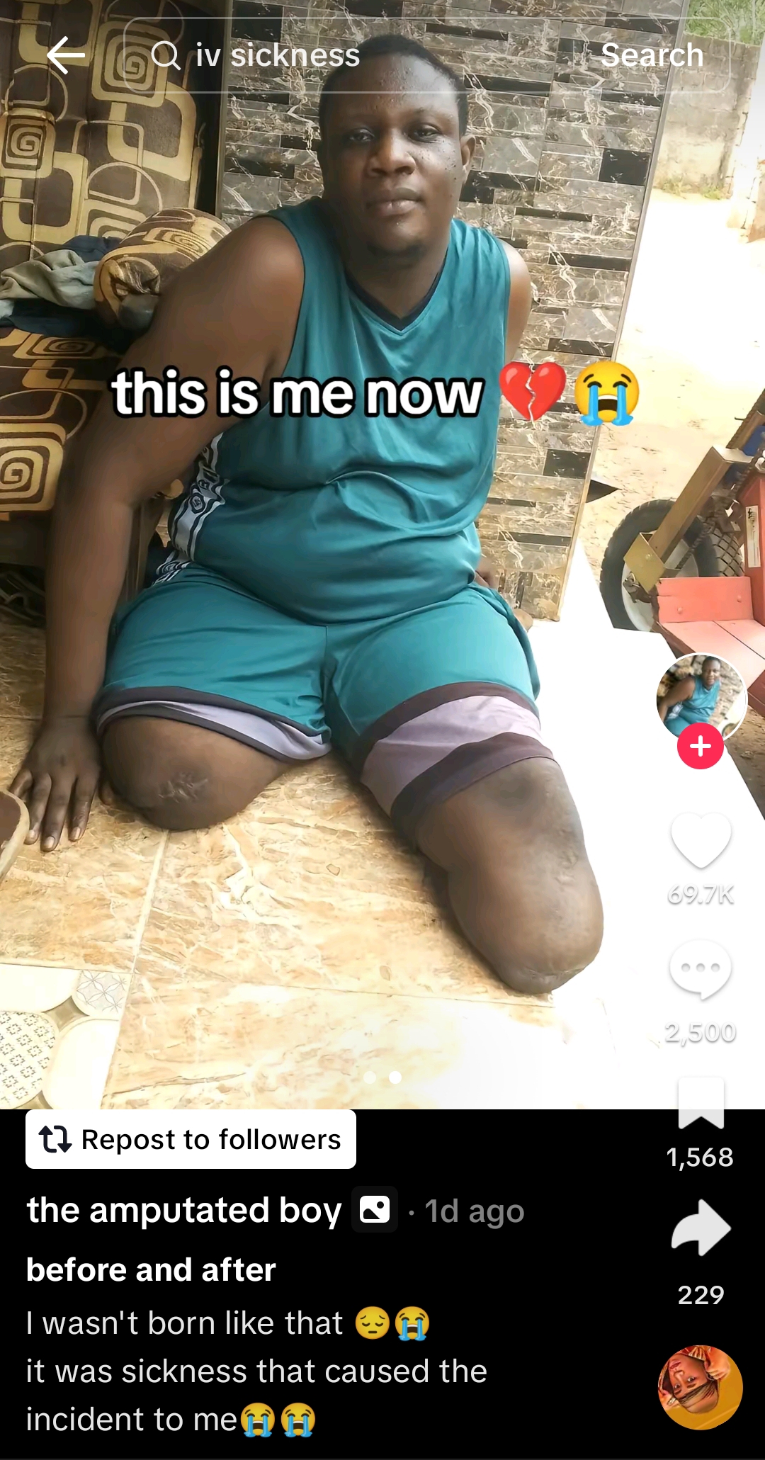 He wrote: “I wasn’t born like that 😔😭. It was sickness that caused this to happen to me😭😭.”