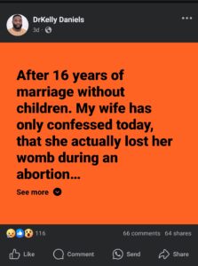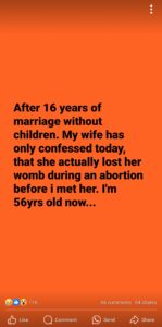 He wrote: “After 16 years of marriage without children, my wife has only confessed today that she actually lost her womb during an abortion before I met her. I’m 56 years old now.”