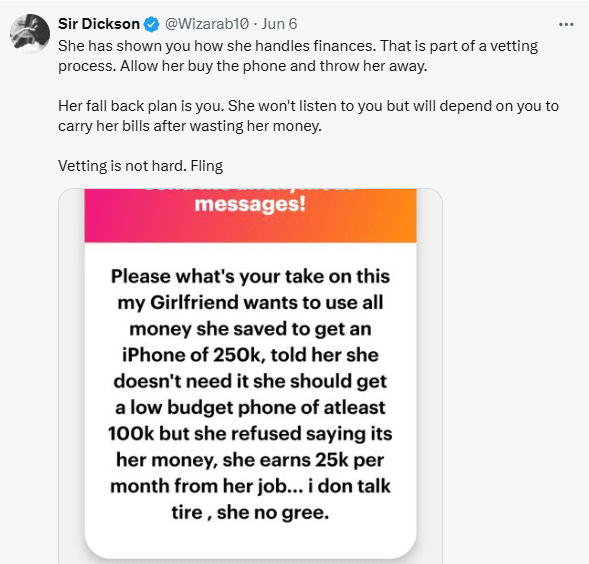 “Please what’s your take on this my Girlfriend wants to use all money she saved to get an iPhone of 250k, told her she doesn’t need it she should get a low budget phone of atleast 100k but she refused saying its her money, she earns 25k per month from her job… i don talk tire , she no gree.”