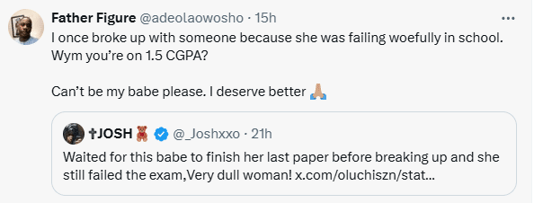 “I once broke up with someone because she was failing woefully in school. Wym you’re on 1.5 CGPA?