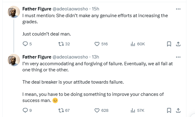 According to him, he found out that the lady he was dating had a CGPA of 1.2.