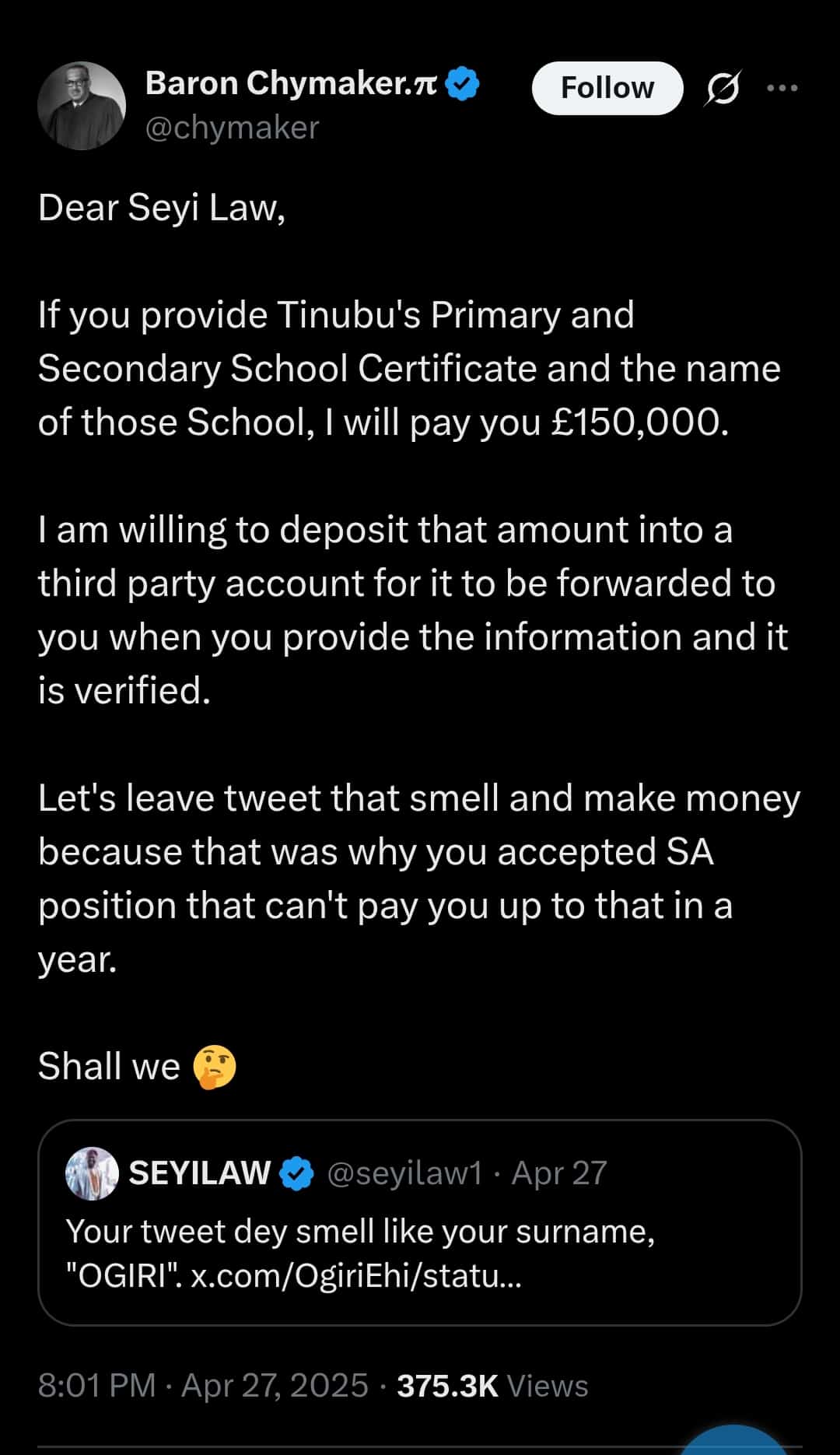 A Nigerian man has publicly offered to reward comedian Seyi Law with £150,000 if he can provide the primary and secondary school certificates of President Bola Tinubu, along with the names of the schools he attended.